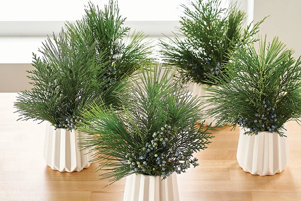 Arrange trimmed evergreen branches and juniper berries in small white vases from Hy-Vee. Every spot is special at your holiday table!