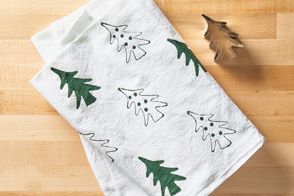 Oh, Tannenbaum! Pour dark green acrylic paint on a paper plate. Dip Christmas-tree-shaped cookie cutters in the paint and stamp them on a solid white tea towel. Repeat in a pattern. For variation, fill in trees using a paintbrush or make ornaments with the tip of a pencil.