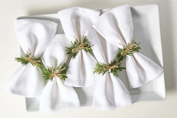 Scents of the season. Tie a single rosemary sprig around a white cloth napkin using twine. Place at each setting for a fresh, fragrant welcome to the table.