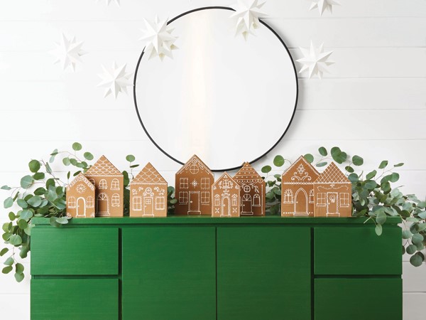 Nestle this neighborhood on your mantle. Cut house shapes from 1/2-inch-thick foam core, cover with brown craft paper, and draw on details in pencil. Outline details with white dimensional paint and let dry. Stand houses up with a foam core easel.