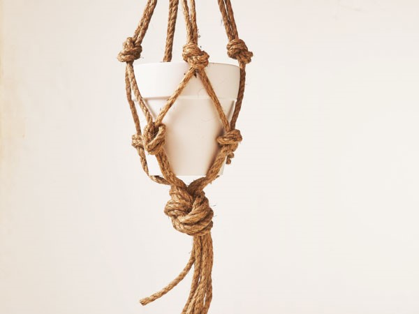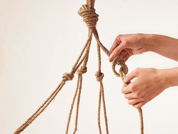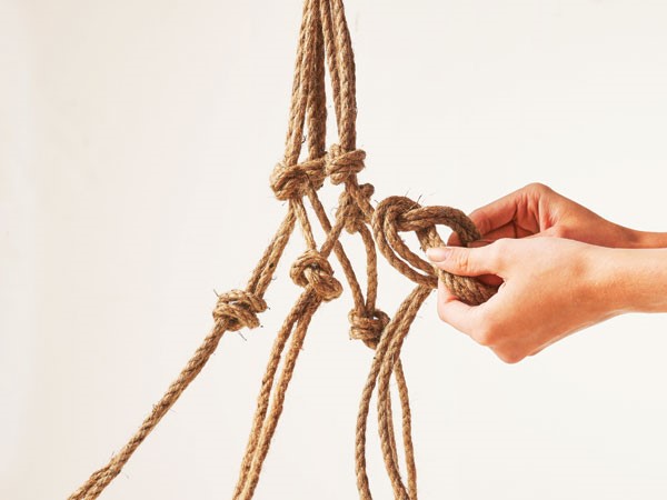 Place pot in the hanger, adjusting knots as necessary to fit the pot.