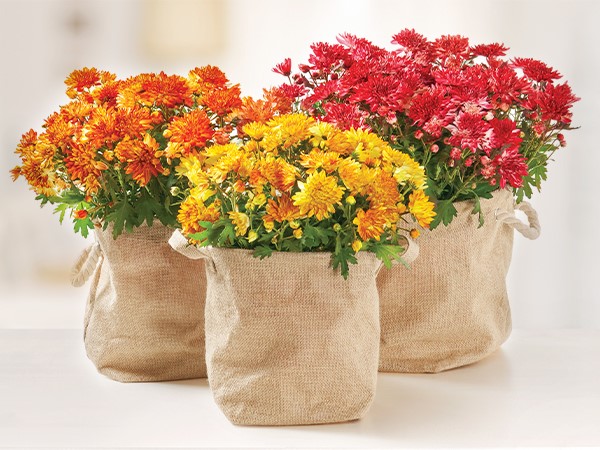 For a porch or covered deck display, place potted mums in burlap carrying bags from the Hy-Vee Floral Department. Choose your favorite mum colors. Flowers in burnished colors like gold, orange, and red convey a truly autumnal display.