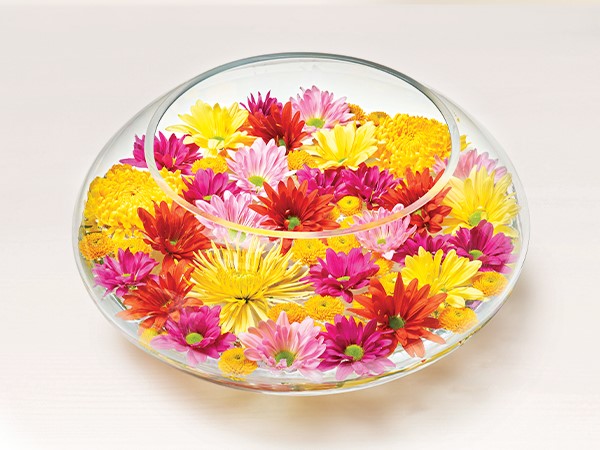 For a varied splash of colors, fill a low bowl or punch bowl halfway with water. Snip mum flowers off stems and drop in water. Pictured: orange, yellow, pink, and purple-pink daisy mums as well as yellow spider mums, "football" mums, and button mums.