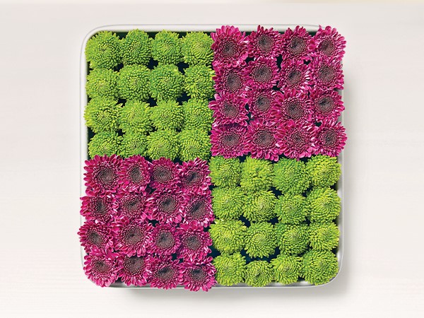 This "cake" is a feast for the eyes, not your tummy! Place a sheet of Oasis floral foam, about an inch thick, into a square baking pan or ceramic dish. Add water. Cut stems to about an inch and push into the wet floral foam. Create a design and color scheme such as these pink and green button mums!