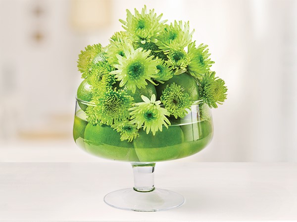 Half the fun of this arrangement is that it's not the traditional color of the season. Stack limes in a compote pedestal bowl, then tuck the long stems of green Kermit button mums between the limes. Fill with water.