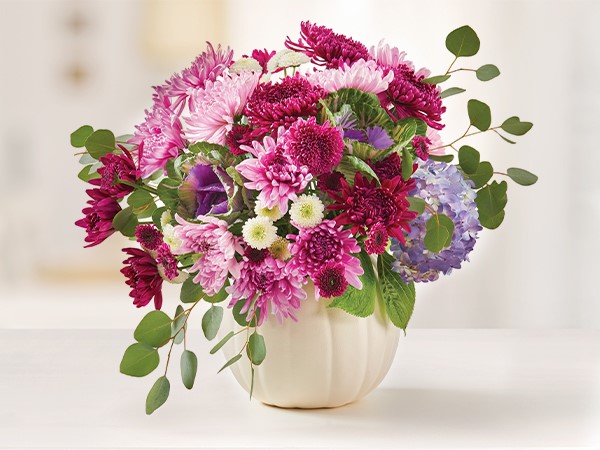 Hollow out a pumpkin—a white pumpkin shows off these pastels, while an orange pumpkin would work with orange, red, and gold mums. Place a vase or other watertight container inside the pumpkin and fill with various types of mums and foliage plants, such as the ornamental kale, hydrangea, and eucalyptus shown here.