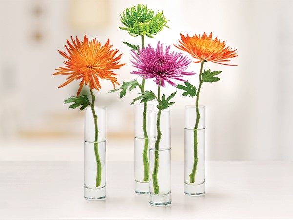 Spider mums are so exotic looking, they practically beg for the spotlight. Show off the artistry of individual flowers by placing them in individual vials or vases. Snip off the majority of the leaves for a cleaner, more modern look that showcases the zig-zagging stems.