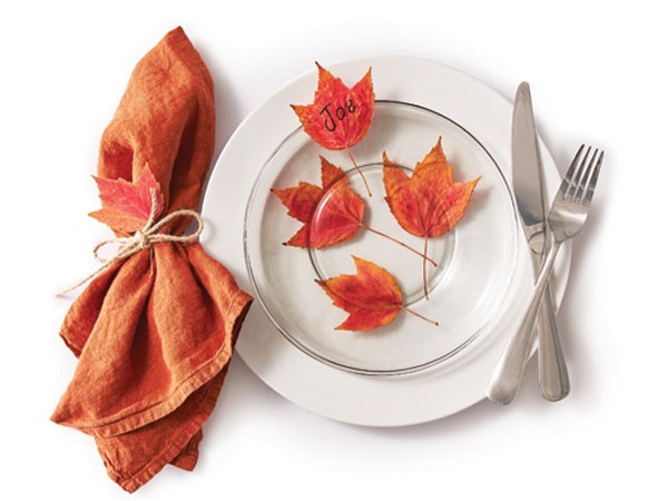 Press bright leaves between two glass salad plates from Hy-Vee for colorful pizzazz. Matching linens tied in twine showcase the fall hues.