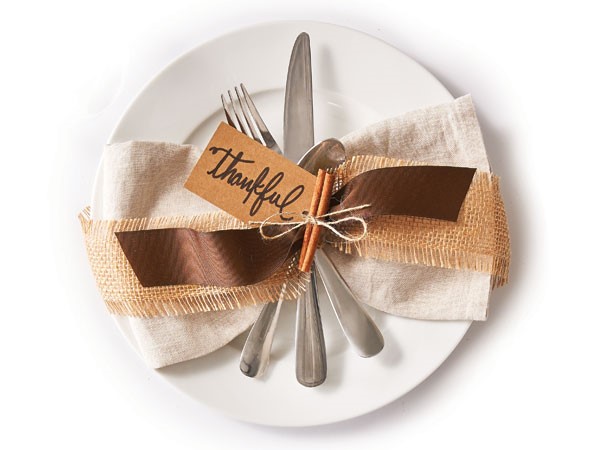 Tie up silverware with twine, burlap, and craft ribbon. Tuck in Hy-Vee Cinnamon sticks and a simple thoughtful message.