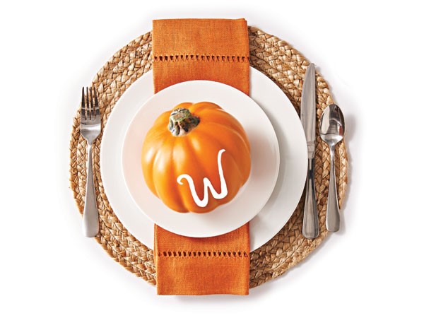 Top salad plates with miniature pumpkins painted with each guest's initials. The colorful pumpkin is a party favor for guests to take home.