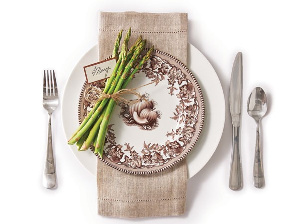 Accent the table with plates from your vintage collection. Wrap asparagus with twine, then attach a place card to the bundle.