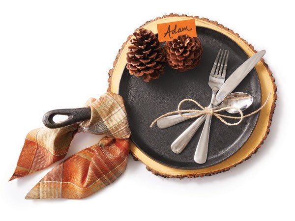 Top a wood slice charger with black plates (or a cast-iron tortilla pan for an extra woodsy-feel), then add a colorful plaid napkin and pine cone name tag holders.