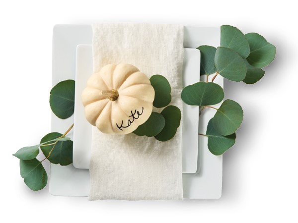 Tuck eucalyptus in between the dinner and salad plate, then wrap both in a napkin and set a personal pumpkin on top.
