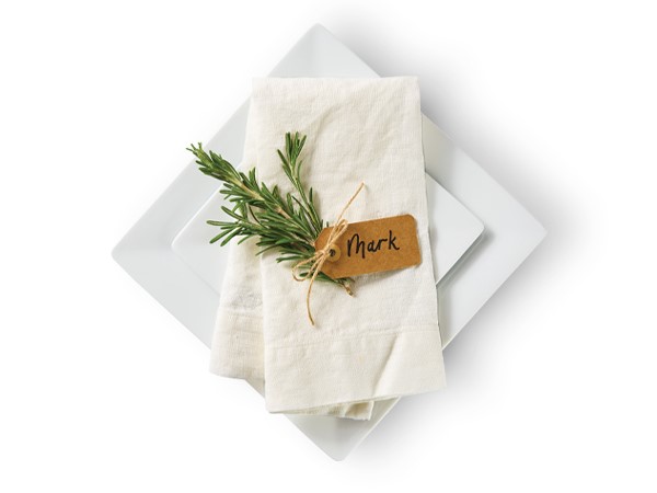Turn the plates to create a new angle. Fold a cloth napkin on top and add a simple name tag with rosemary and twine.