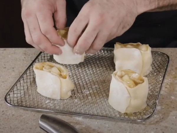 1. Preheat air fryer to 400 degrees according to manufacturer's directions. Dust a clean workspace with flour. Lay puff pastry on surface and spread with apple pie filling about 1-inch from top. Roll from bottom to top and trim ends, slice into 4 equal pieces.