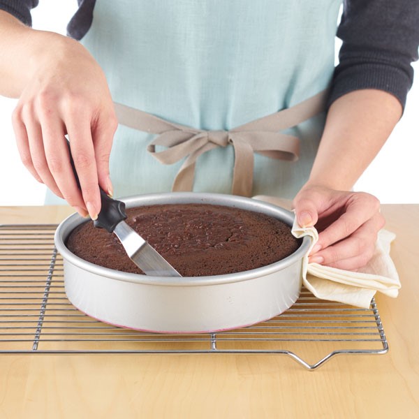 2. Allow cake layers to cool for 10 minutes, then run a thin metal spatula around the edges of the cake pan.