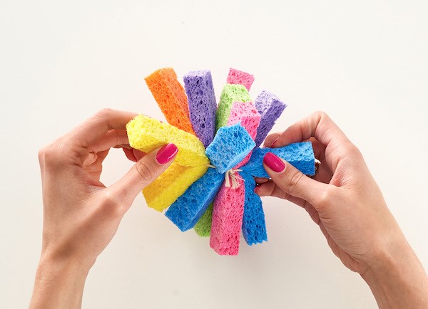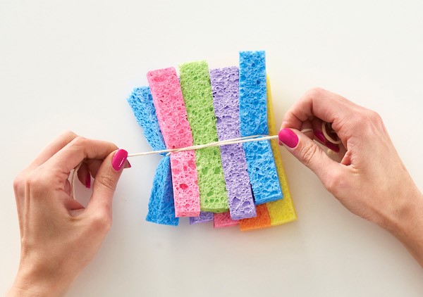 Line up the sponge strips and tie them together in the center with sturdy string. You should have about 9 to 12 strips.