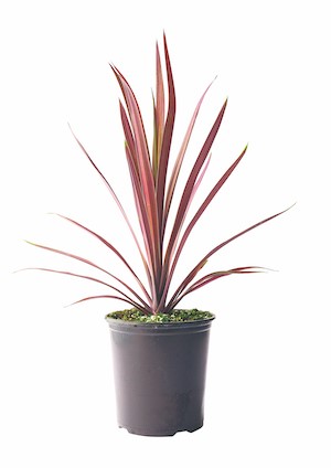 Although considered an indoor plant, cordyline, also known as red dracaena, doubles as a focal point in outdoor containers surrounded by sprawling annual flowers.
