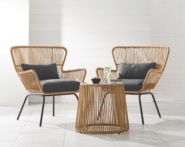 Looking for a Bohemian-inspired table for two? This 3-piece steel open woven bistro set has the look of genuine wicker but is made with weather-resistant materials.