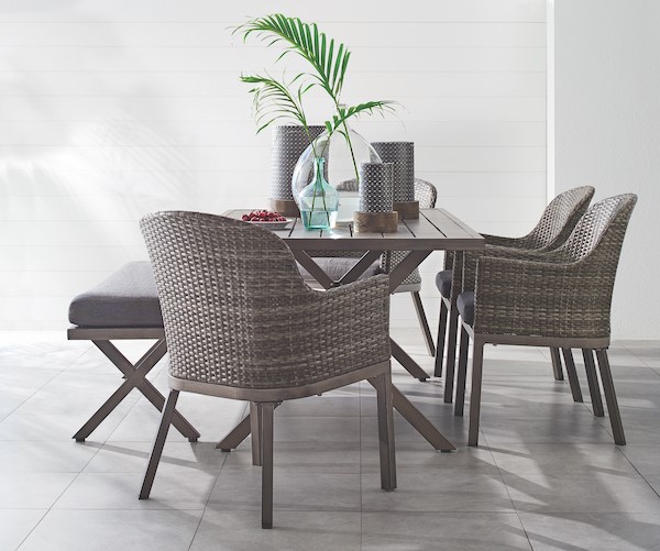 Clean lines and sturdy construction give this dining set true staying power. Outdoor lighting and table decorations are easy and welcome touches.
