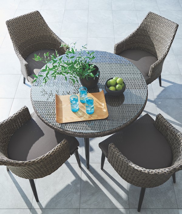 With classic curves and neutral colors, this weather-proof wicker dining set has a timeless appeal that won't grow stale. The glass top makes cleanup super easy, and there's even room for an optional umbrella. This 5-piece set is perfect for dinner outside with the family or a friendly game of cards.