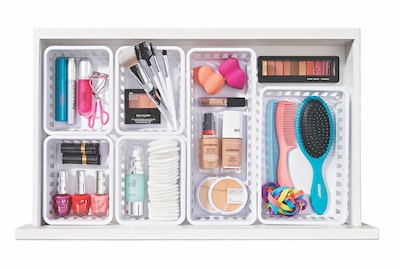 Here's our advice for cosmetics situation: Fit according to your products. Put combs, brushes and hair bands in one basket and use separate bins for makeup according to type: foundation, concealer and facial sponges in one, brushes and powdered makeup in another, nail polishes and lipsticks in yet another.