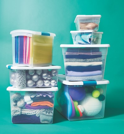 Look around for any off-season items that you don't need in the coming months. Seasonal decorations, accessories, sporting equipment, for example—store these items in Sterlite, Hefty, and other covered bins.
