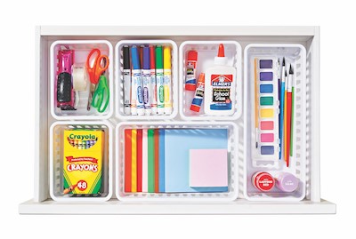 Separate schoolwork and art supplies according to size and shape in bins for crayons, markers, paint boxes, brushes, glue and glue sticks, paper and kid-safe scissors.