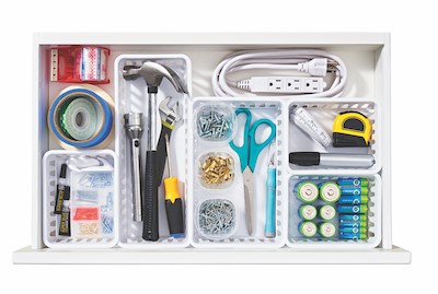 You know the one. Unjumble a junk drawer of household hardware and utility items. In designated bins, electric cords or chargers, scissors, batteries, often used tools, picture hanging supplies, tapes and glue are ready the moment they’re needed. Tuck odd-shape sizes into open nooks.