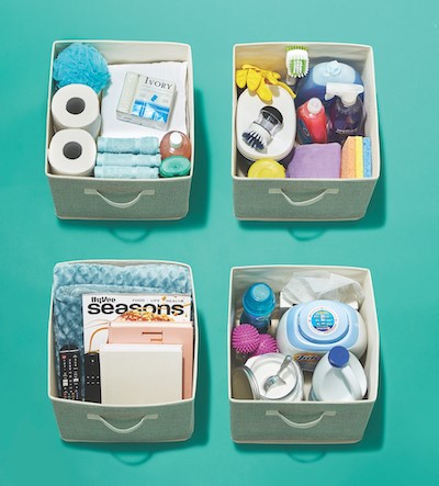 5. Store a squeegee, shower spray, disinfectant wipes and other bathroom cleaning supplies in a bin in an under-sink cabinet.