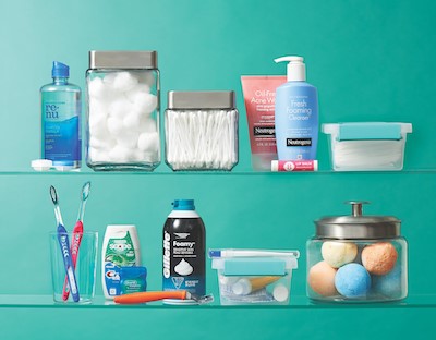 2. Put other frequently used items—hairstyling tools, lotions, makeup—in upper vanity or cabinet drawers, within easy reach when hands and face may be wet.