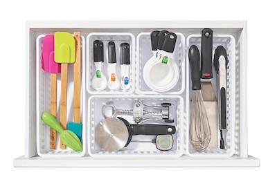 Divvy up cooking tools. Store oblong spatulas, tongs, skewers and whisks in long bins, stubby items in square ones. Use tiny bins for tea balls, corn cob holders or bag clips.