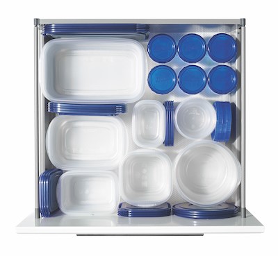 So here's what to do about those lids: Clear out the drawer and clean it. Then stack like sizes, and use the lids as dividers. Finally, snap lids on the smallest containers.