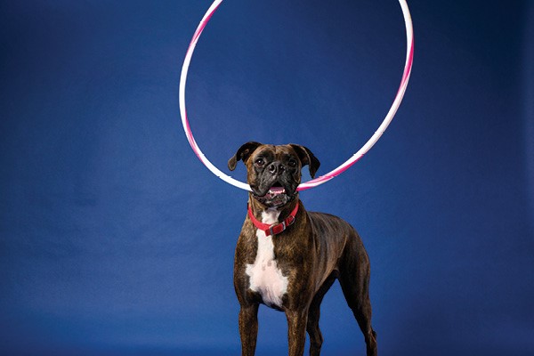 Hold a hula hoop at ground level. Use a treat to coax your dog through the hoop. Keep elevating the hoop, so your dog is eventually jumping.