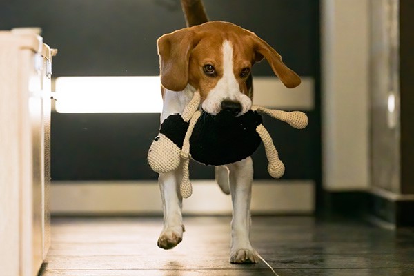 Toss your dog’s favorite toy across the room a few times, instructing him to “Go get it!” Next, put him in another room, hide the toy, issue the same command, and let the hunt begin!