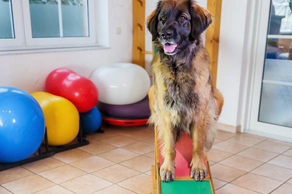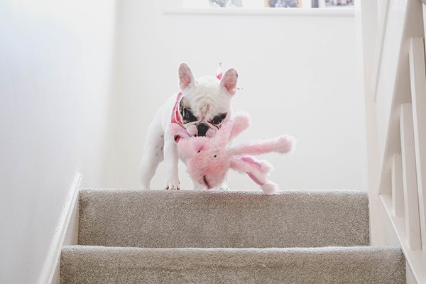Try tossing a favorite toy up the staircase while holding your dog’s collar. Then release! Reward your dog for bringing it back. Steps are a great workout.