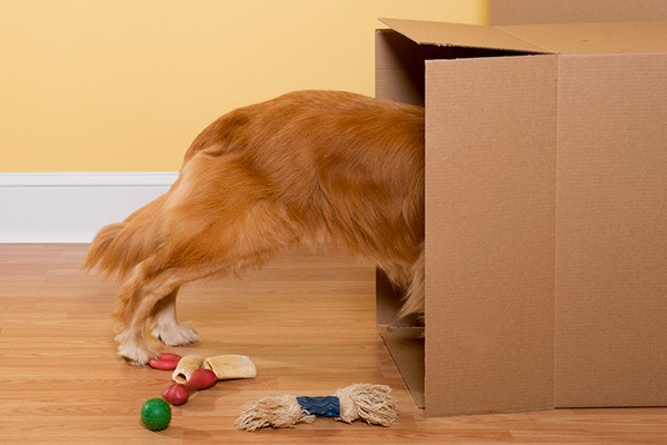 Place a few treats inside a box, inside another box, and so on. (Cereal boxes are perfect!) Supervise your dog ripping through the boxes in search of a reward to chomp!