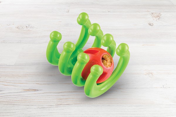 Your dog will work for a little pile of peanut butter inside a treat-dispensing toy, like the Chase ‘n Chomp Ribcage with Ball available at Hy-Vee.