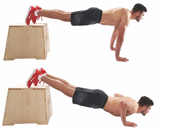 Start in push-up position with feet on a plyo box or raised platform. Maintaining a straight back, gradually lower your chest until it nearly touches the ground. Press upward.