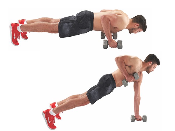 Start in push-up position, feet on the floor, upper body raised off the ground and hands gripping dumbbells. Lower your chest toward the floor, then push up before it touches. Once arms are straight, pull weight in right hand to right side of the chest. Gradually lower arm. Alternate.