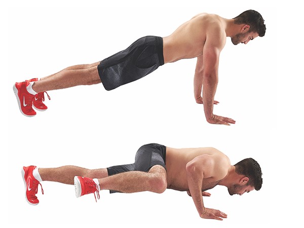 Start in push-up position, feet on the floor and upper body raised off the ground. Lower your chest toward the floor while simultaneously bringing your right knee toward your right elbow. Push yourself back to starting position. Alternate.
