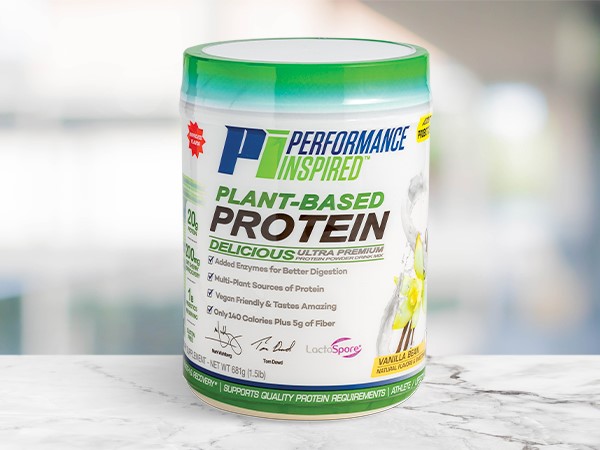 Performance Inspired Plant-Based Protein contains 20 grams of protein from plant sources, such as brown rice, alfalfa, and peas. Look for it in your local Hy-Vee's HealthMarket, or order on Aisles Online