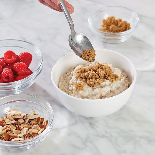 Serve oatmeal topped with brown sugar, raspberries, and toasted almonds.